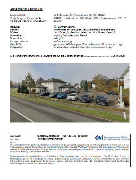Am Ortsrand von Vöcklamarkt, direkt an der L1287 „Pfaffinger Straße“, steht auf dem 1.765 m² großen Grundstück großes Wohn- und Geschäftshaus in einem Mischgebiet zum Verkauf. Das Grundstück besteht aus zwei Bauparzellen und ließe im Westen auch noch eine großzügige Erweiterung oder aber auch einen weiteren Neubau eines Objektes zu.